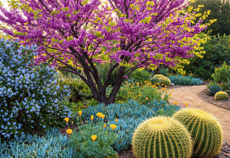 And I am not just talking about common flowering trees or plain green canopies; there are exotic ones as well, like the Desert Willow with its orchid-like, delicate blooms dancing in hot inland valleys! A California garden does not need to be a thirsty one! And when we say colorful, we also mean bark in peeling copper and cinnamon tonalities, or leaves turning a fiery crimson tonality in fall, or a silvery blue…